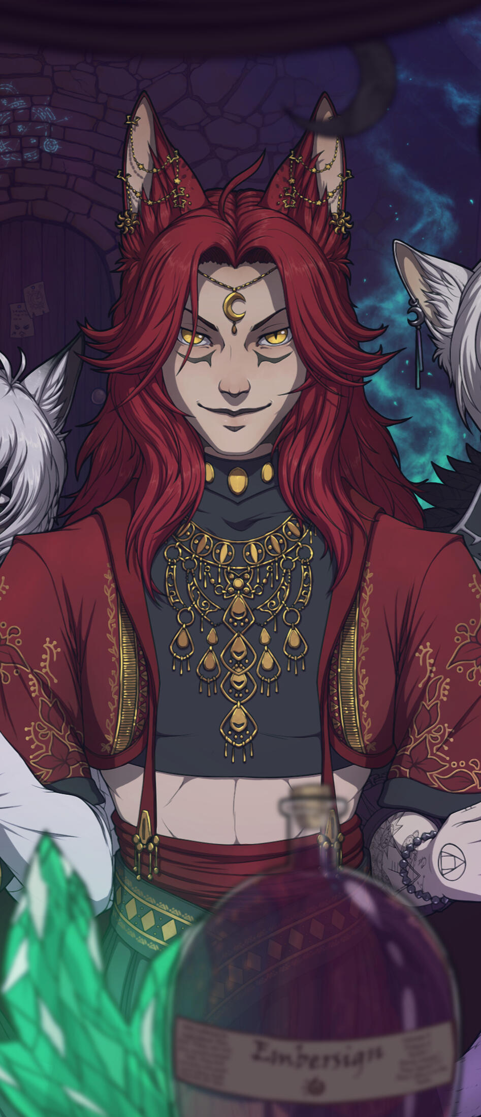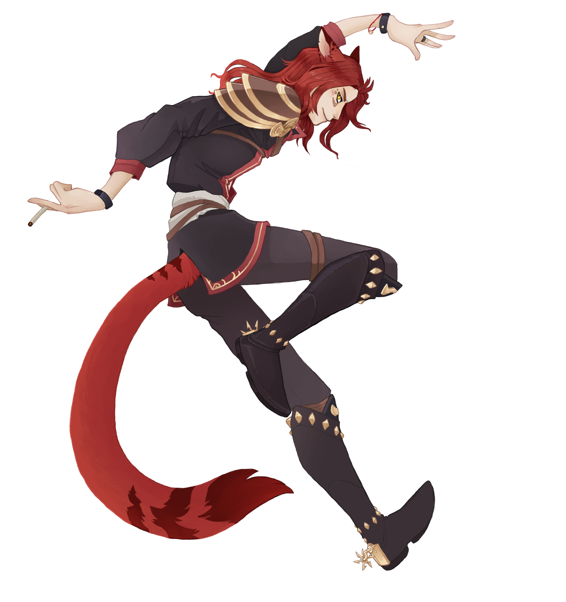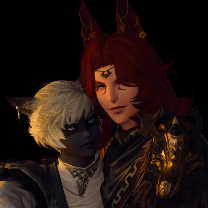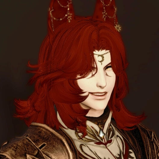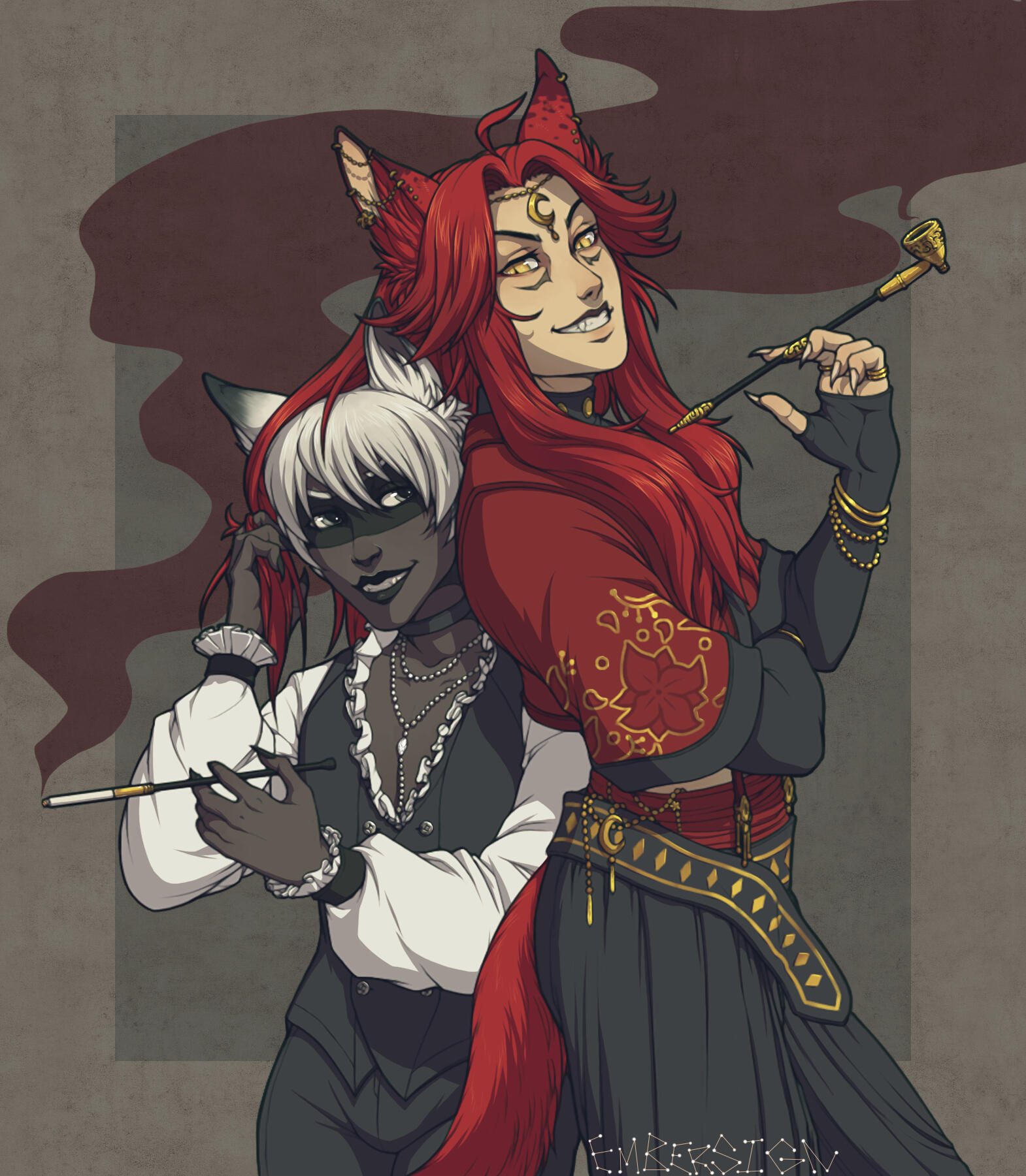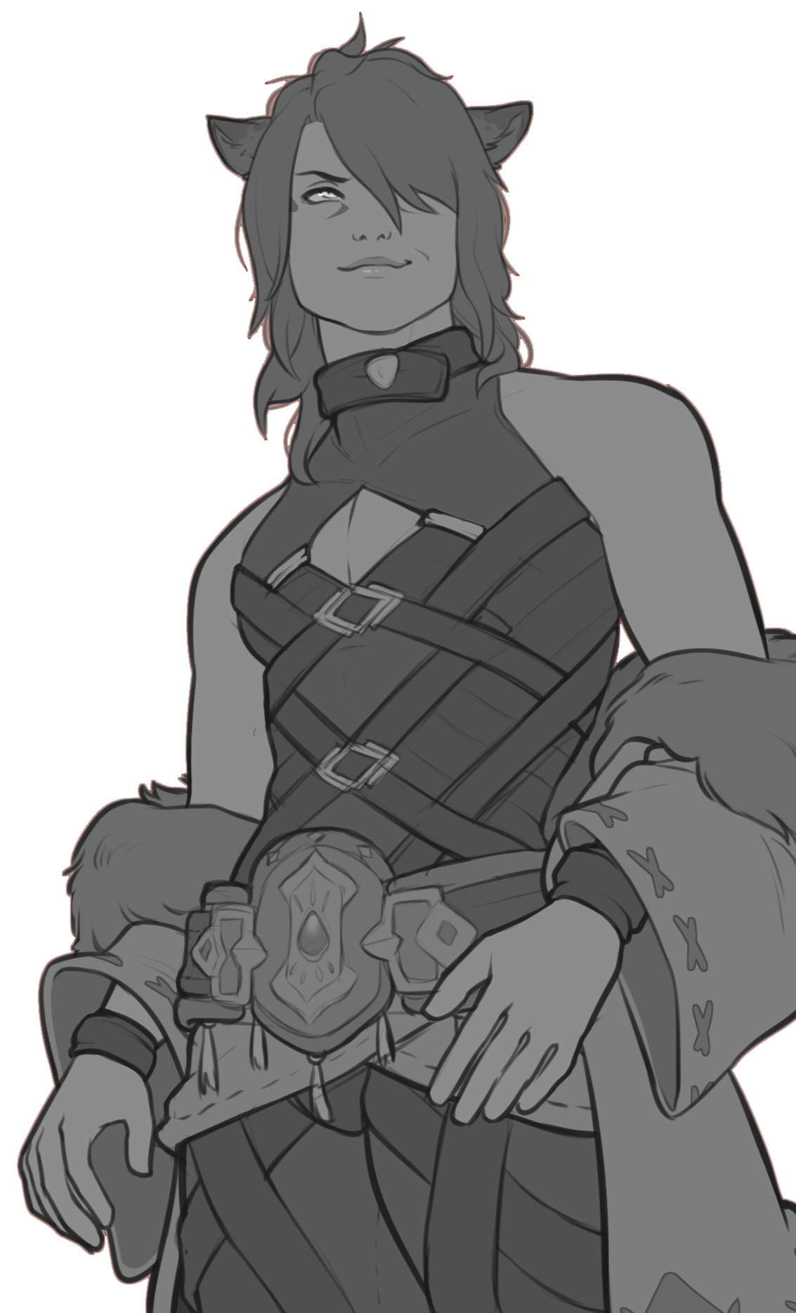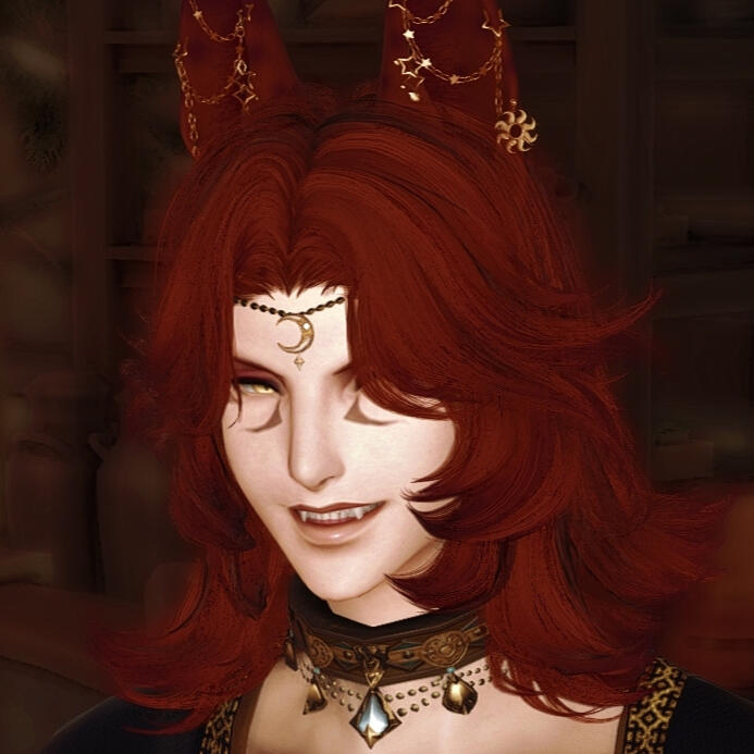 Although he could be considered conventionally attractive, just one look at this rogue of a Miqo'te and you can practically tell he's going to be trouble. He has a wicked fanged grin and mischievous look. At least when he's in a good mood.Lean and wiry, he seems built for speed, stealth and agility over strength. He's still somewhat underweight after getting over his drug addiction, and as much as he likes to think he could overpower anyone in a fist fight.... he's more like a Ferret than a fighter. He's fairly tall for a Miqo'te, but there isn't a lot to him aside from his incredibly fluffy hair. His tail and ears are both incredibly expressive and will always betray his mood.He likes to wear a lot of fancy gold jewellery, many chained piercings in his ears and a bejewelled collar always around his neck. He also has multiple bracelets and rings that match. He prefers to dress as if he were some kind of Thavnairian bride, with layers of fancy fabrics draped over him and lots of intricate little pieces of gold.