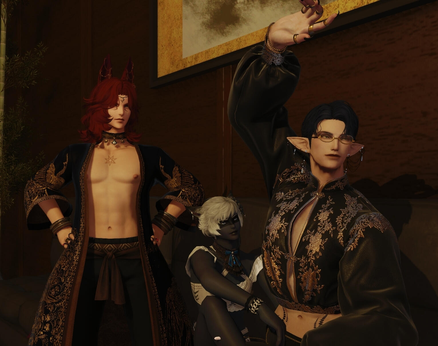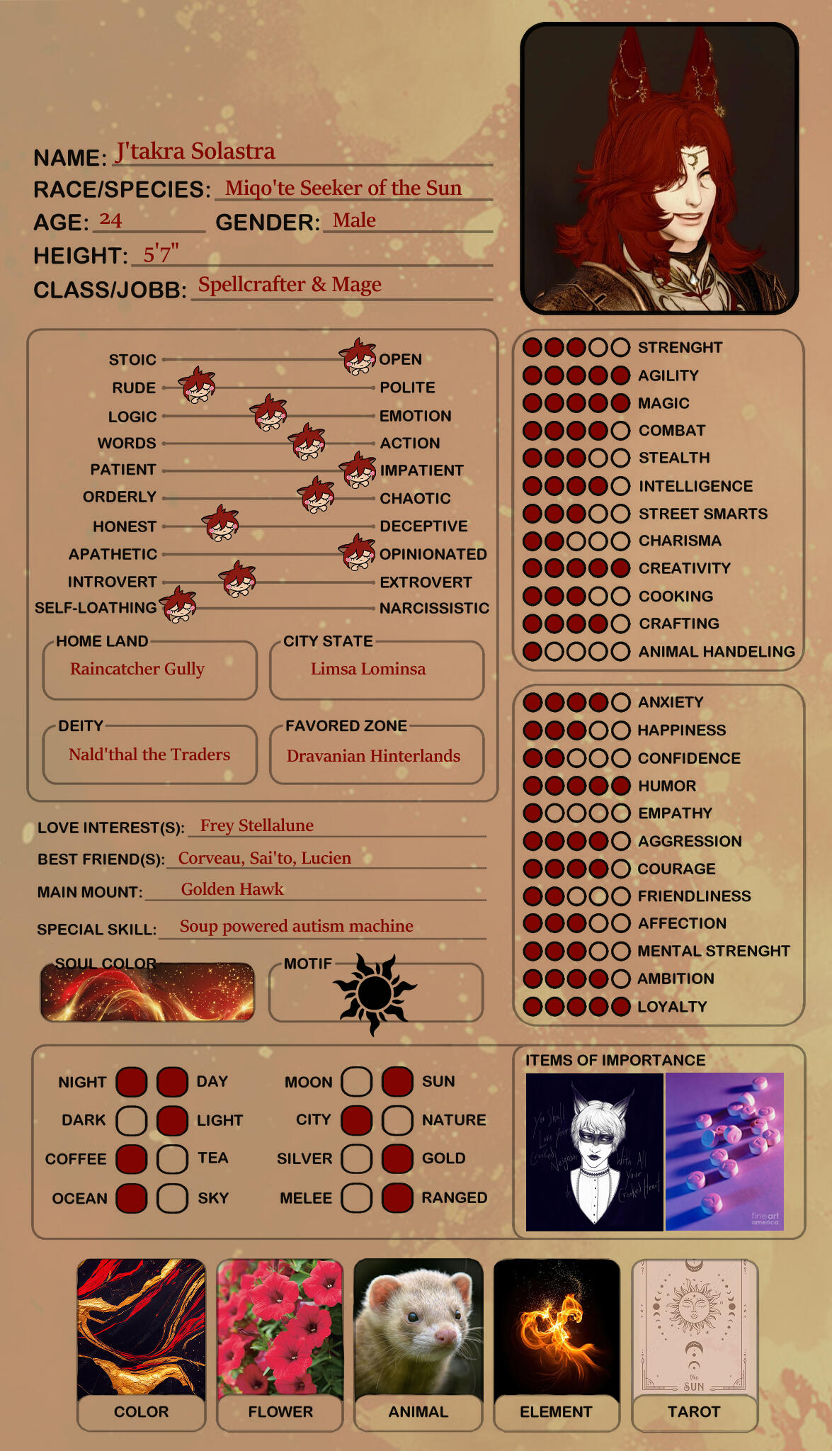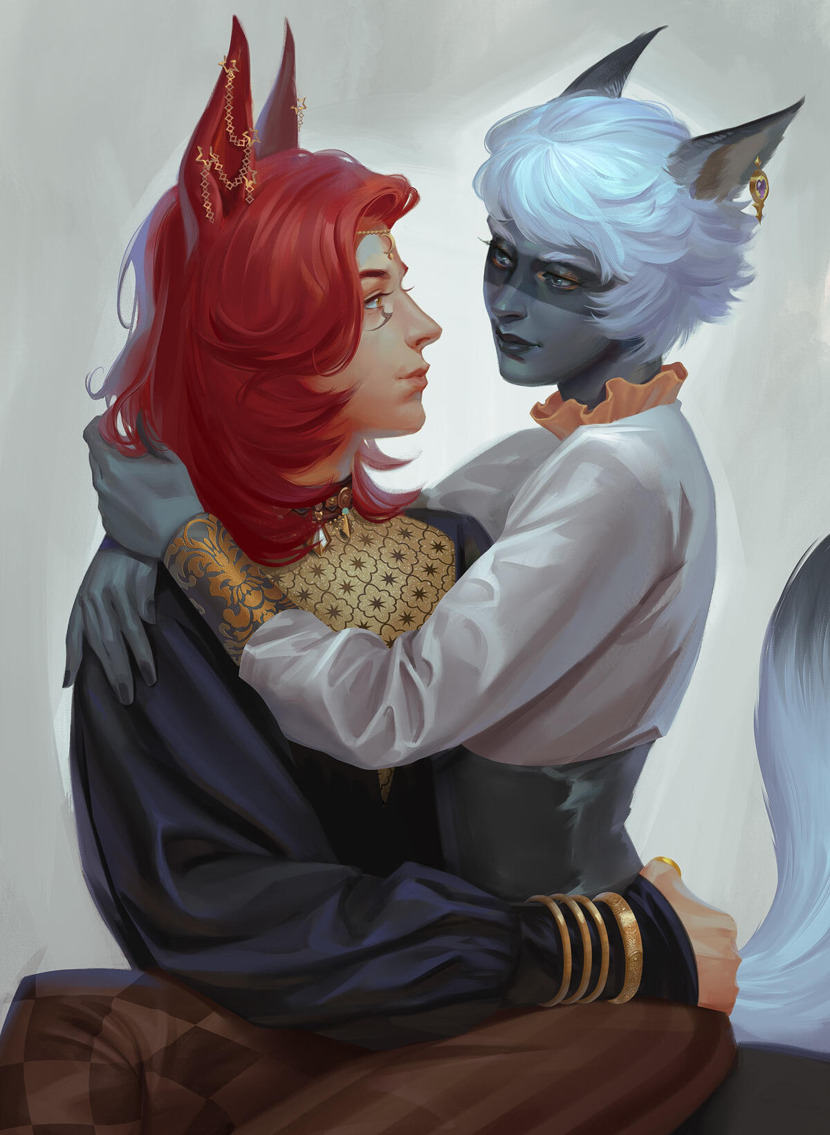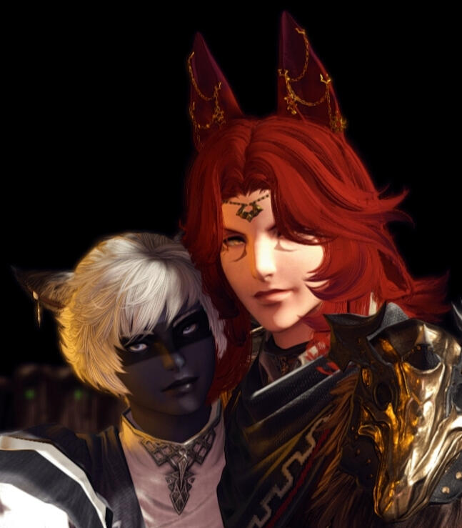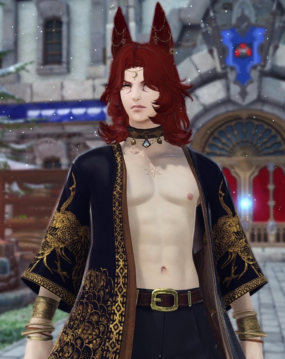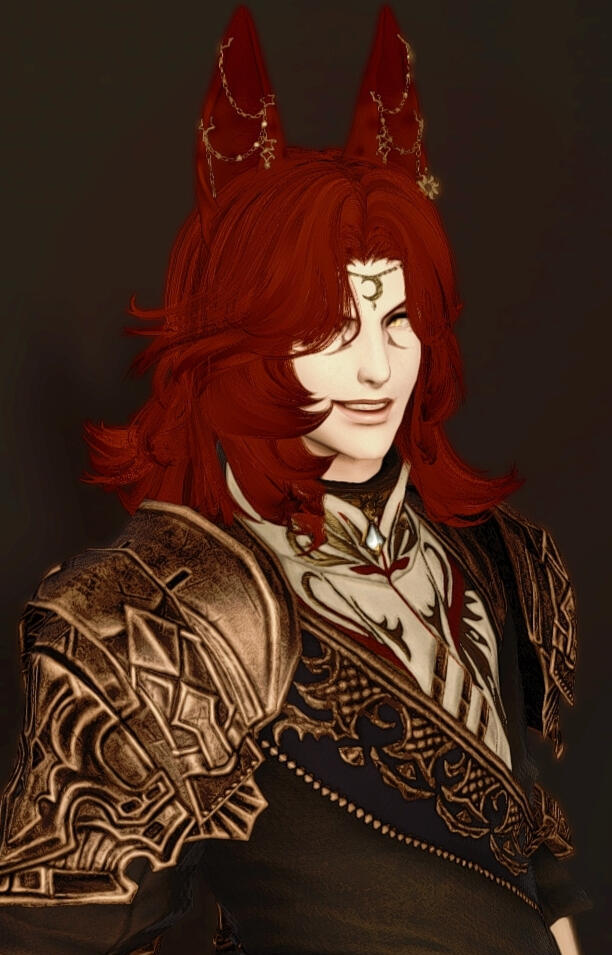 Although he could be considered conventionally attractive, just one look at this rogue of a Miqo'te and you can practically tell he's going to be trouble. He has a wicked fanged grin and mischievous look. At least when he's in a good mood.Lean and wiry, he seems built for speed, stealth and agility over strength. He's still somewhat underweight after getting over his drug addiction, and as much as he likes to think he could overpower anyone in a fist fight.... he's more like a Ferret than a fighter. He's fairly tall for a Miqo'te, but there isn't a lot to him aside from his incredibly fluffy hair. His tail and ears are both incredibly expressive and will always betray his mood.He likes to wear a lot of fancy gold jewellery, many chained piercings in his ears and a bejewelled collar always around his neck. He also has multiple bracelets and rings that match. He prefers to dress as if he were some kind of Thavnairian bride, with layers of fancy fabrics draped over him and lots of intricate little pieces of gold.