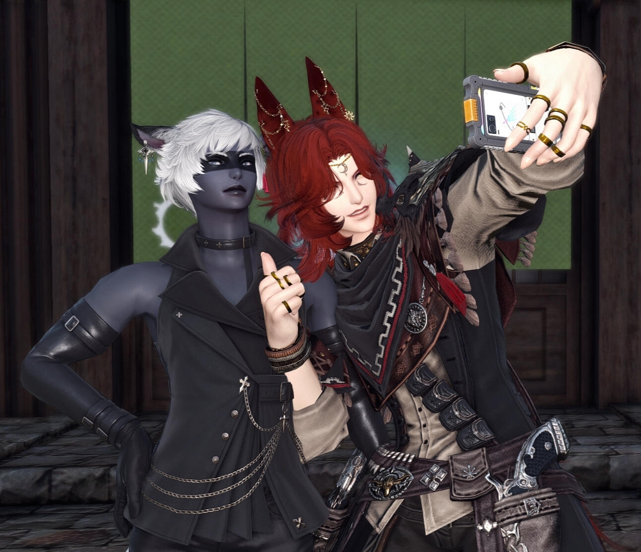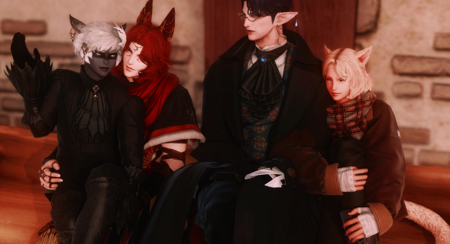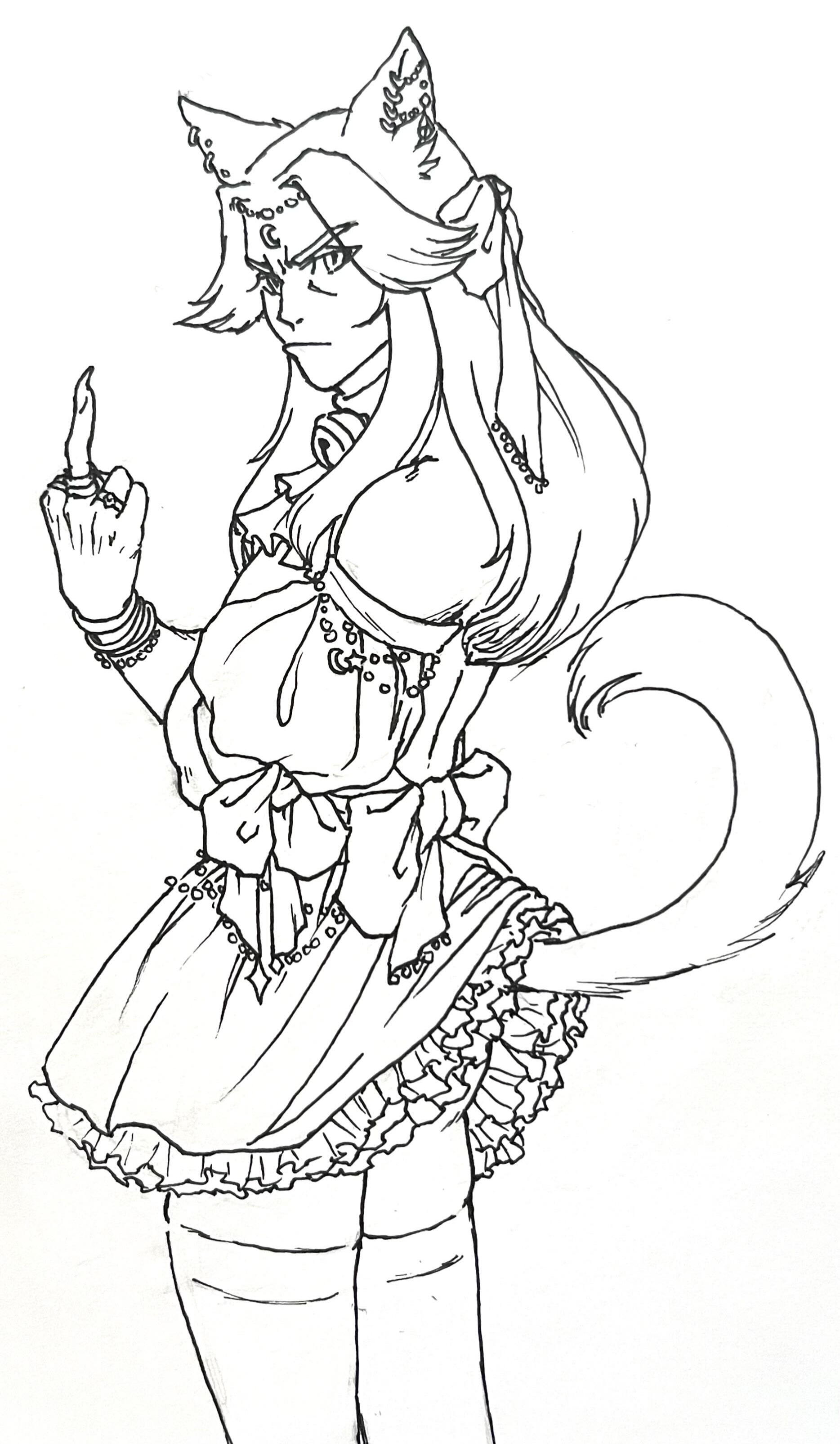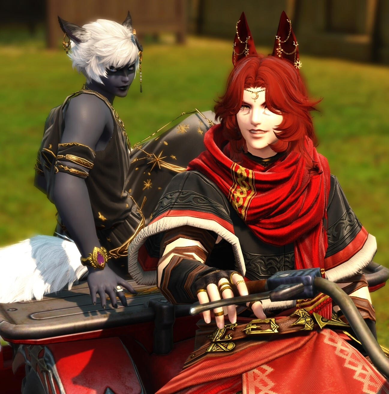 Although he could be considered conventionally attractive, just one look at this rogue of a Miqo'te and you can practically tell he's going to be trouble. He has a wicked fanged grin and mischievous look. At least when he's in a good mood.Lean and wiry, he seems built for speed, stealth and agility over strength. He's still somewhat underweight after getting over his drug addiction, and as much as he likes to think he could overpower anyone in a fist fight.... he's more like a Ferret than a fighter. He's fairly tall for a Miqo'te, but there isn't a lot to him aside from his incredibly fluffy hair. His tail and ears are both incredibly expressive and will always betray his mood.He likes to wear a lot of fancy gold jewellery, many chained piercings in his ears and a bejewelled collar always around his neck. He also has multiple bracelets and rings that match. He prefers to dress as if he were some kind of Thavnairian bride, with layers of fancy fabrics draped over him and lots of intricate little pieces of gold.