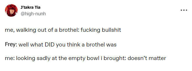 LIKES: FREY!! Causing problems on purpose, Hedonism, Drugs, Sex, Booze, Smoking, Guns, Biting, Forbidden magic, Opulence, Gold, Ships, Snuggling, Treasure, Triple triad, Showing off, Casual hookups, Pillows, Ear scritches, Play fighting, Crime, Sleeping in sun beams, Praise, Games, Contests, Winning.