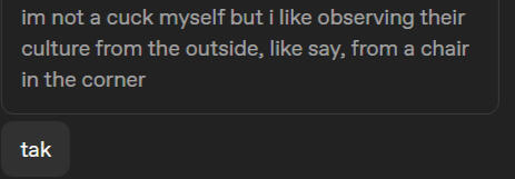 Brash, cheeky and full of bluster, this cat can sometimes be a bit of a challenge to get along with. Antagonistic attitude and filthy sense of humour can make for some... interesting situations. He also tends to get rather moody at times, and is capable of going from sedate to explosive temper in mere moments. He's easily set off by certain things, but he's all bark for the most part.Incredibly blunt, he isn't afraid to say exactly what's on his mind, no matter how tactless it may be. Though, when it comes to giving compliments or anything implying he might care, that's where he struggles. A very 'It's not like I care about you or anything, idiot' Kind of attitude. He is secretly kind of soft, his bluster often just a front to hide his insecurity.He likes to poke and try and get a rise out of people. Nosy as all hells and not afraid to ask personal or invasive questions. Tak struggles quite a lot with basic empathy, however, even when he's trying his best. He's pretty much a clueless idiot when it comes to how others are feeling. He often leans towards changing the topic or just bolting when situations get difficult.Being raised in a tribe, there are a few habits he was never able to break. He tends to be possessive and jealous over anything he's decided belongs to him. That can include objects, places or people. He's become much better about not acting out over it, but can still become comically moody if he feels a line was crossed.He has a habit of talking a big game in order to make up for his low self-esteem. Often bragging about himself in some way or another. Should one look deeper, however, his projected confidence is often nothing but a cover for this insecure rescue cat with trust issues.Above most other things, Tak loves pleasure. Things that taste good, feel good, or are even just entertaining. He has a large hedonistic streak that is only dampened somewhat due to past trauma. He's always eager to partake in offered drugs and is quite prone to getting into misadventures because of his eternal pursuit of a good time.In spite of the fact that it can be a challenge to get to know the real Tak, he makes for a very loyal and protective friend. Once one reaches that level, of course.